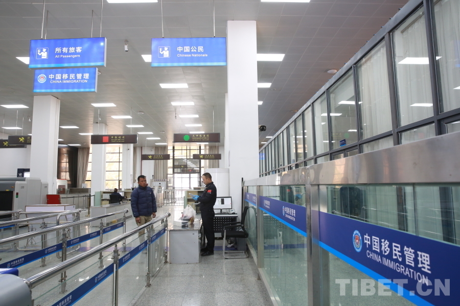 圖為12月1日,吉隆口岸聯(lián)檢大廳正式啟用新版對外開放口岸出入境邊防檢查現(xiàn)場標志 攝影:肖富貴