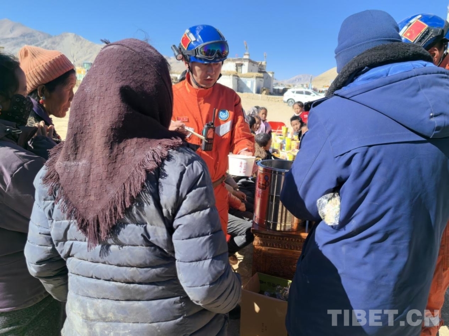 圖為拉薩森林消防大隊救援人員正在為西藏自治區(qū)日喀則市定日縣曲洛鄉(xiāng)措昂村受災(zāi)群眾分發(fā)熱乎乎的燉菜和饅頭 拉薩森林消防大隊供圖