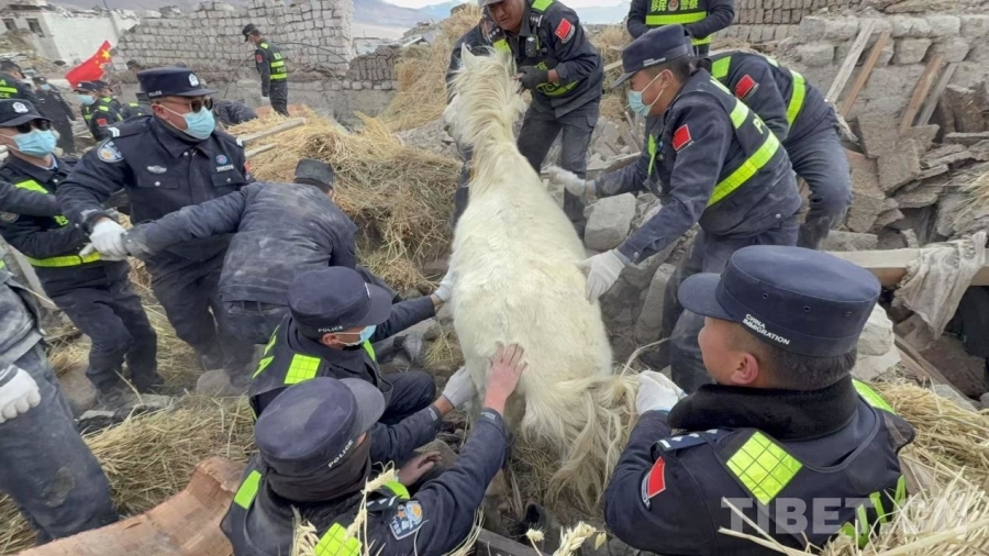 隨后,救援民警迅速前往扎西多布杰鄰居普赤家里開展搜救,為普赤家救出6頭存活羊只。