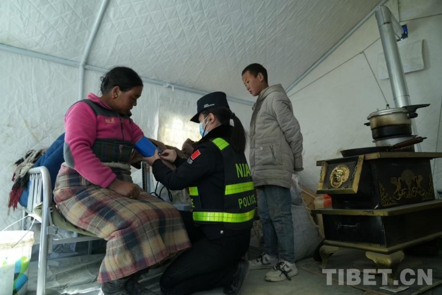 圖為在西藏定日縣長所鄉(xiāng)玉白村安置點,定日邊境管理大隊民警黃曉娟正在給災(zāi)區(qū)群眾量血壓 攝影:蔣美靈