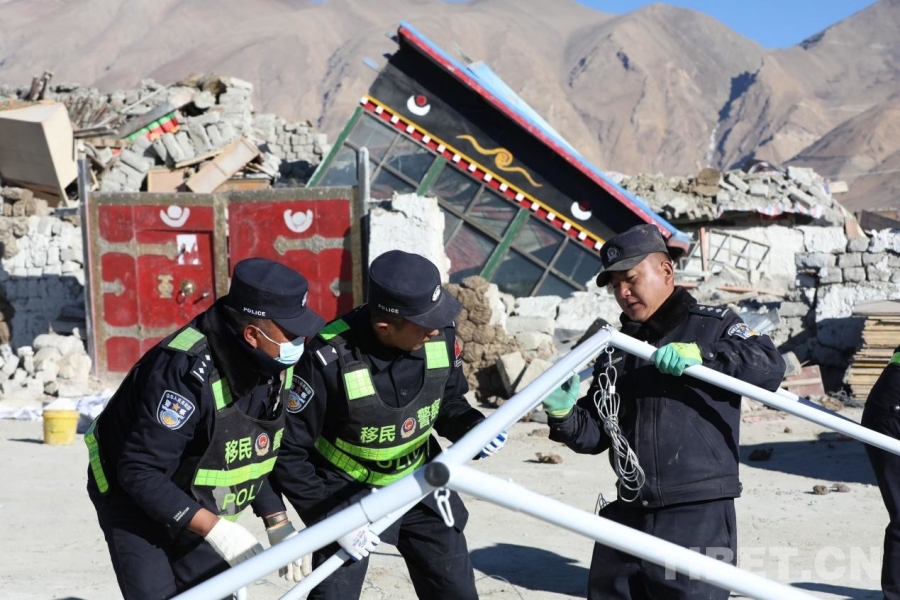 圖為在西藏日喀則市定日縣長所鄉(xiāng)玉白村安置點,移民管理警察為群眾搭建帳篷 攝影:郭遠(yuǎn)敬
