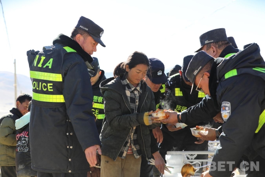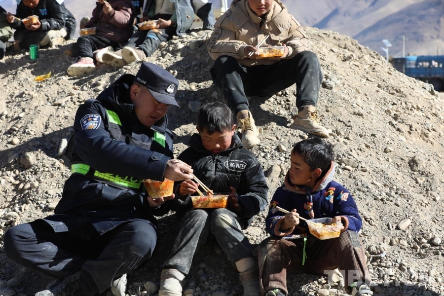 圖為在日喀則市定日縣長所鄉(xiāng)雜村安置點(diǎn),移民管理警察為小朋友和群眾提供午餐 攝影:郭遠(yuǎn)敬