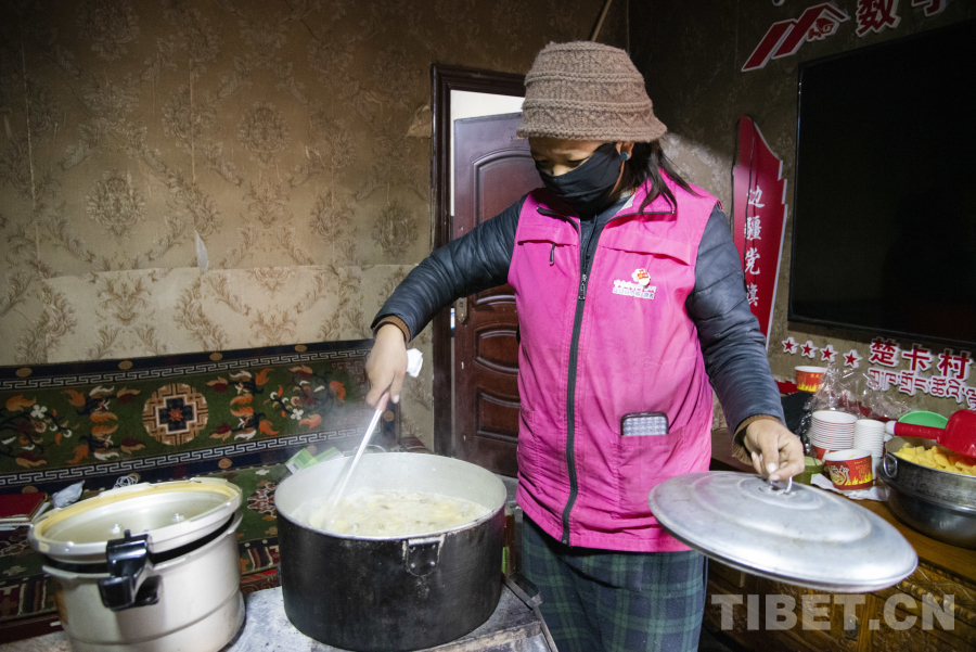 在楚卡村12歲以下的兒童、60歲以上的老人,以及一直以來工作在村安置點一線的工作人員共計70余人的三餐都由這個小小的廚房供給。達娃央宗說:“平常我們也會做一些酥油茶送給村中的老人,和他們喝茶聊天,就是給他們心理輔導。”