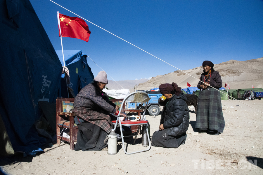 圖為楚卡村安置點村民正在帳篷外喝酥油茶 攝影:趙振宇