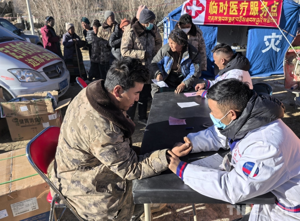 圖為日喀則邊那倉(cāng)藏醫(yī)院醫(yī)護(hù)人員為災(zāi)區(qū)群眾巡診問(wèn)診