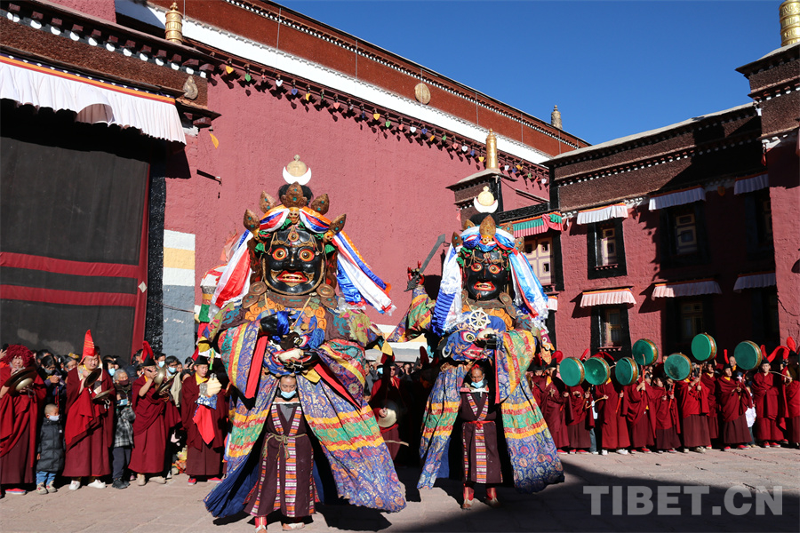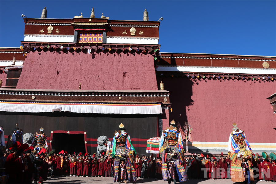 圖為從各處迎請(qǐng)出的大黑天等神像在薩迦寺院內(nèi)廣場(chǎng)匯合,跳金剛舞 攝影:王妍丹