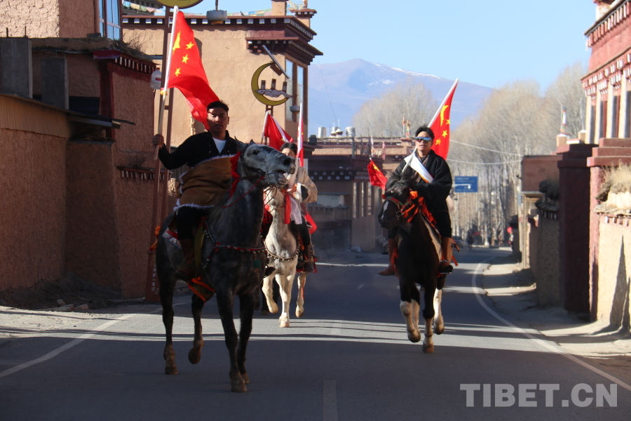 馬術(shù)巡游隊伍來到理塘東山頂上,俯瞰縣城全景,并展開祝福橫幅,用藏漢雙語高聲祝愿全國各族人民新春吉祥。