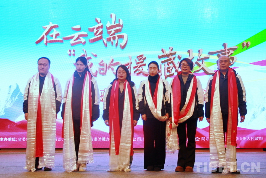 圖為“在云端·我的援藏故事”涉藏州縣行活動在四川省阿壩州松潘縣進行宣講,6位優(yōu)秀援藏干部人才身披羌紅和哈達(dá)合影 攝影:劉莉