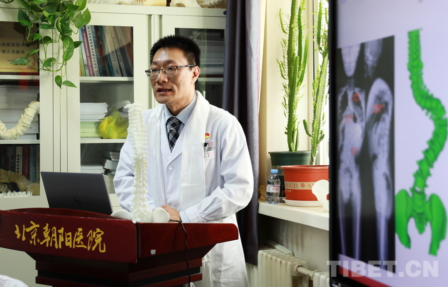圖為北京朝陽醫(yī)院骨科主任、首都醫(yī)科大學(xué)骨外科學(xué)系主任、國際腰椎研究學(xué)會候任主席海涌介紹該院骨科團隊在救治高海拔地區(qū)脊柱側(cè)彎患者方面所做的工作 攝影:劉莉