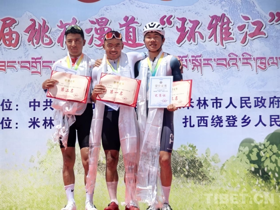 4月9日,米林市第一屆桃花漫道“環(huán)雅江”山地自行車賽舉行。圖為男子組比賽前三名合影,中間為冠軍吐爾松江·布爾力克 攝影:王淑