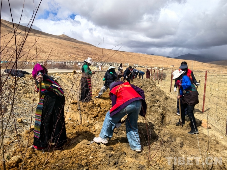 伴隨著一次次鐵鍬鑿擊地表的“嚓嚓”聲、此起彼伏的藏語勞動歌曲和樹苗抖動的“沙沙”聲,一排排規(guī)整的樹坑網(wǎng)格慢慢被鑿出,一棵棵象征希望的樹苗緩緩落下,一抔抔承載著綠色生命的黃土再次埋下,村主干道邊綿延80余米的“綠色生命線”初見雛形,120余棵樹苗挺立村道兩側,以“綠絲帶”串聯(lián)村莊,為春日家園增添盎然生機。