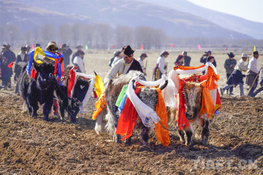 祈福儀式后,極具民族特色的二牛抬杠耕作表演精彩上演。來自三個片區(qū)的耕作者身著藏繡華服,用哈達裝飾耕牛,以傳統(tǒng)木犁翻土開壟,在雄渾的勞動號子中,勾勒出千年農(nóng)耕文明的鮮活圖景。