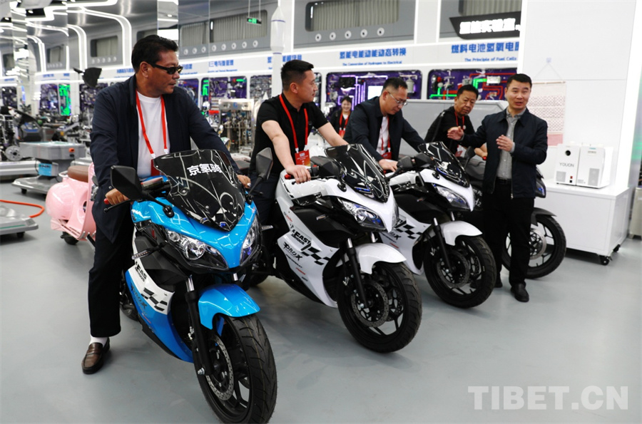 圖為西藏自治區(qū)工商聯(lián)民營(yíng)企業(yè)家赴京學(xué)習(xí)參觀團(tuán)一行體驗(yàn)氫能摩托車(chē) 攝影:劉莉