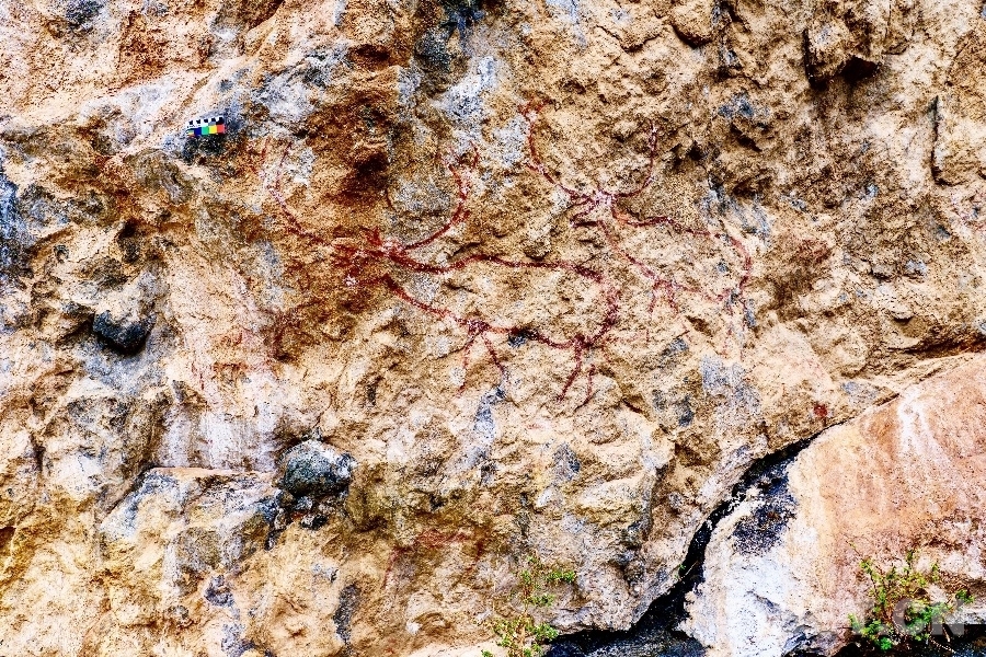 周行康:2023年6月,在海子山管委會巡山團隊提供線索指引下,經過數(shù)次實地調查,我們在“海子山-格聶”區(qū)域發(fā)現(xiàn)了紅顏料涂繪類巖畫群。通過邀請國內考古權威機構來現(xiàn)場采樣、并經實驗室測定,我們確認這批巖畫是距今8000年前的古老創(chuàng)作。目前從世界范圍來看,石刻類巖畫的測年還沒有得到一個有效的解決,青藏高原的石刻類巖畫,一般推斷為距今3000多年,因而這批更久遠的舊石器時代的“海子山-格聶”巖畫就顯得更有意義,而且它是目前已知的世界上同類風格巖畫中海拔最高的巖畫——位于海拔4721米的高度。