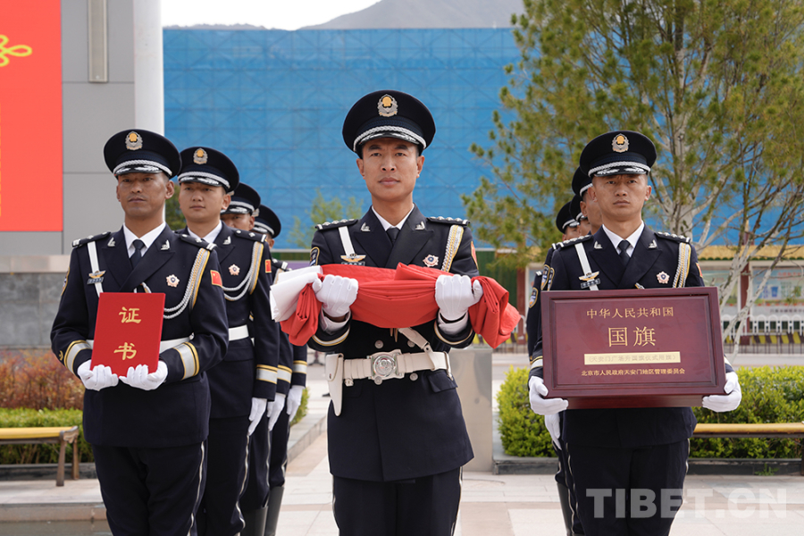 圖為國(guó)旗護(hù)衛(wèi)隊(duì)護(hù)送國(guó)旗至昌都市革命歷史博物館 攝影:群旦次仁