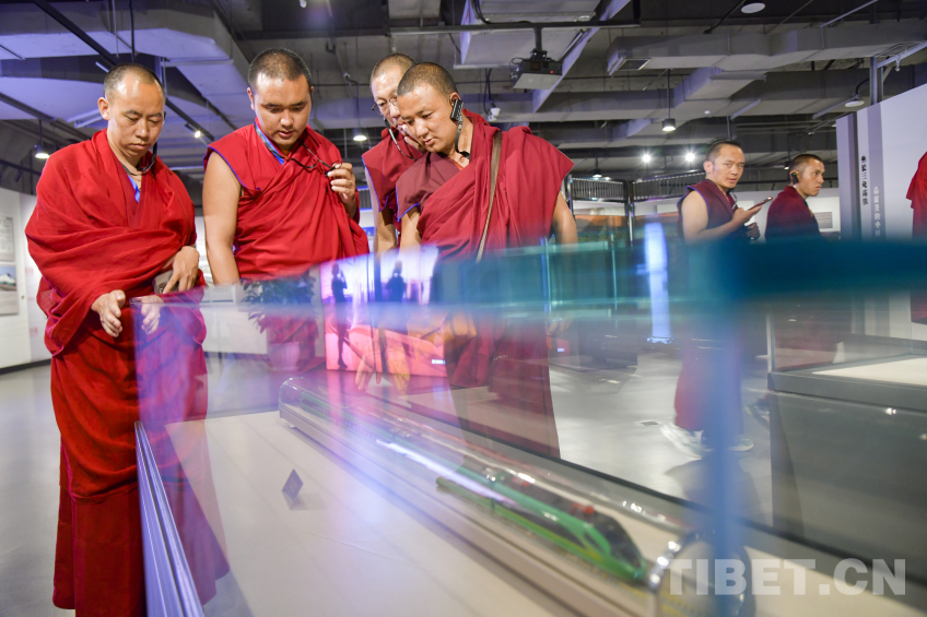 圖為西藏佛學(xué)院師生在高原“綠巨人”復(fù)興號(hào)動(dòng)車(chē)組模型前駐足 攝影:趙振宇