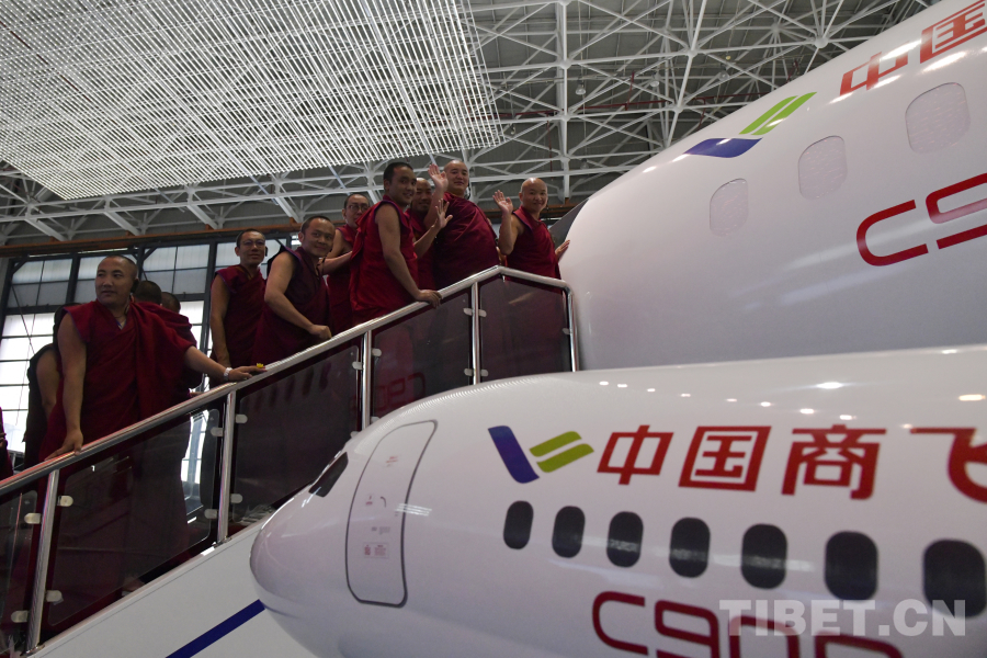圖為西藏佛學(xué)院師生在中國(guó)商飛公司登上國(guó)產(chǎn)飛機(jī)C909模型機(jī)參觀 攝影:趙振宇