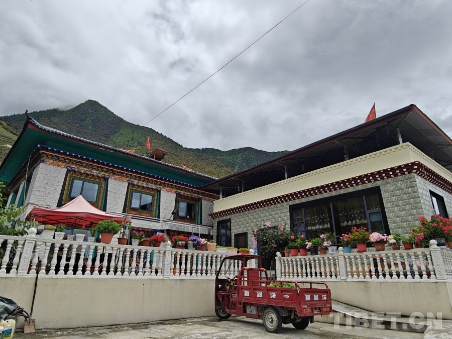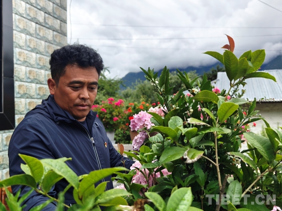 圖為村黨支部宣傳委員、村委會(huì)副主任尼瑪多吉在打理自家院子