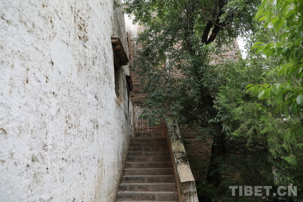 圖為位于四川省甘孜州鄉(xiāng)城縣青德鎮(zhèn)布機(jī)村的宗薩木府樓梯與旁邊的老山桃樹 攝影:劉莉