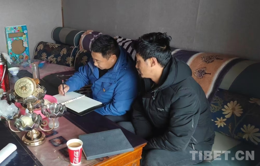 圖為老沙開周(左)在當曲村管護員家中了解相關工作