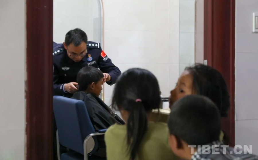 圖為民警在便民理發(fā)室為當(dāng)?shù)睾⒆永戆l(fā)