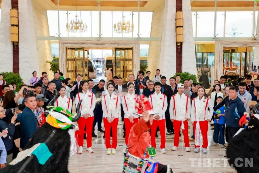 圖為奧運(yùn)冠軍一行抵達(dá)西藏拉薩,受到熱烈歡迎