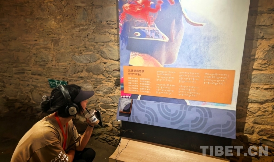 圖為游客參觀強吉莊園公共文化活動中心時通過影音設備聆聽歌曲《達娃卓瑪悲歌》 攝影:劉莉