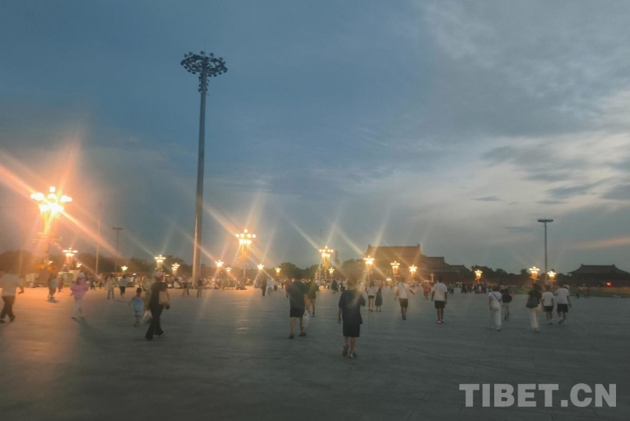 暑期的天安門廣場更加熱鬧,不僅有一家老幼同游的家庭,有旅行社帶來的各地旅游團(tuán),最多的是各種學(xué)校、團(tuán)體組織的大大小小的學(xué)生團(tuán),他們身著不同顏色款式的服裝,共同等待著激動人心的時刻?!吧胶油}·京華筑夢”研學(xué)團(tuán)的少年們便是其中一員,他們穿著淺藍(lán)色的T恤,戴著白色的棒球帽,散發(fā)著西藏少年的朝氣。