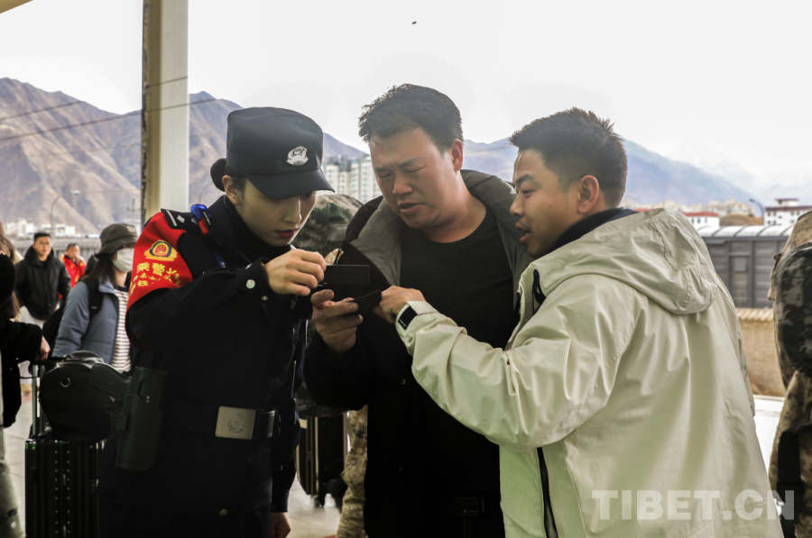 圖為米瑪次仁向旅客進行安全提示 攝影:普布旦增