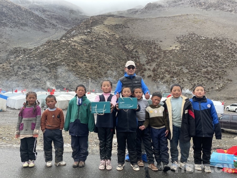 圖為馬志剛在比如縣扎拉溝向當?shù)啬撩窈⒆荧I愛心 受訪者供圖