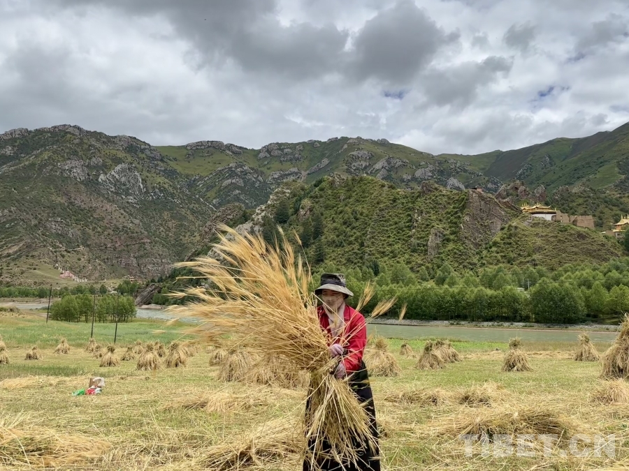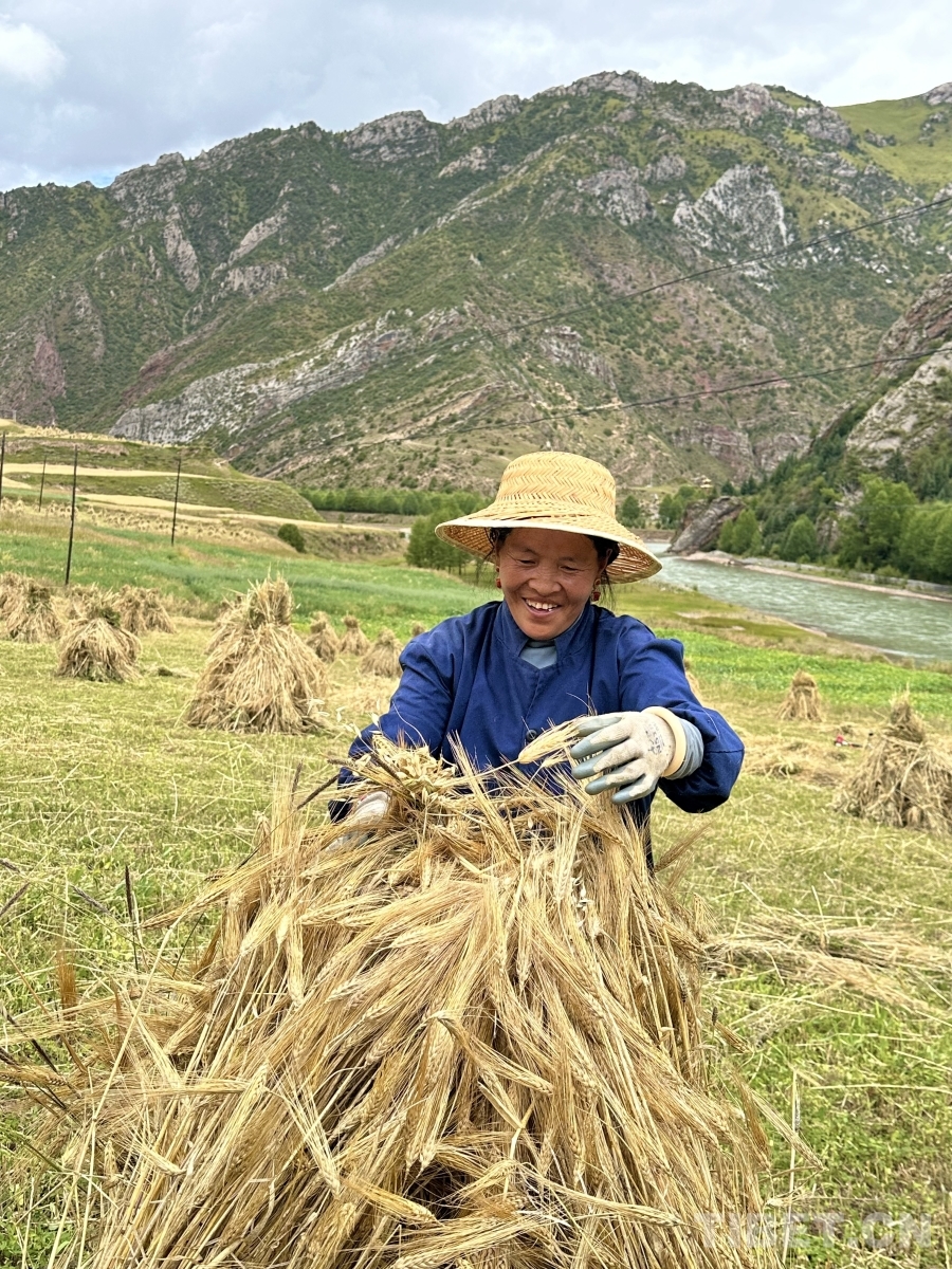 眼下,飽滿的青稞穗隨風(fēng)搖曳,村民們熟練地彎腰、揮鐮、捆扎,田間地頭呈現(xiàn)出一派繁忙景象?!敖衲暧晁?,青稞長得也比往年好?!币晃淮迕褚贿呅χ?,一邊向我們展示剛剛捆好的青稞麥堆。