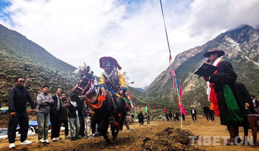 圖為西藏自治區(qū)山南市貢嘎縣昌果鄉(xiāng)普夏村望果節(jié)賽馬會(huì)上村里請(qǐng)來(lái)的民間藝人(圖右)擔(dān)任主持人介紹出場(chǎng)騎手 攝影:劉莉