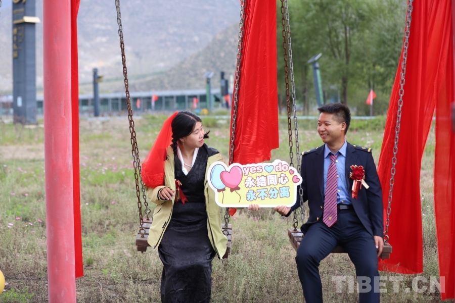 在全場來賓的祝福中,兩對身穿鐵路制服和民族服飾的新人成為本次集體婚禮的耀眼主角,在現(xiàn)場同事的見證下,在拉薩地區(qū)特有的藏戲祝福聲中,完成了一場終生難忘的儀式。新人王克龍與武春燕并肩坐在秋千上,目光緊緊相依;愛情長廊中,另一對新人張慶強(qiáng)與蔡雨欣共同掛上同心鎖。