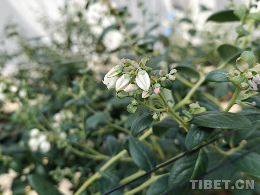 圖為戈壁田園現(xiàn)代農(nóng)業(yè)項(xiàng)目?jī)?nèi)待結(jié)果的藍(lán)莓花