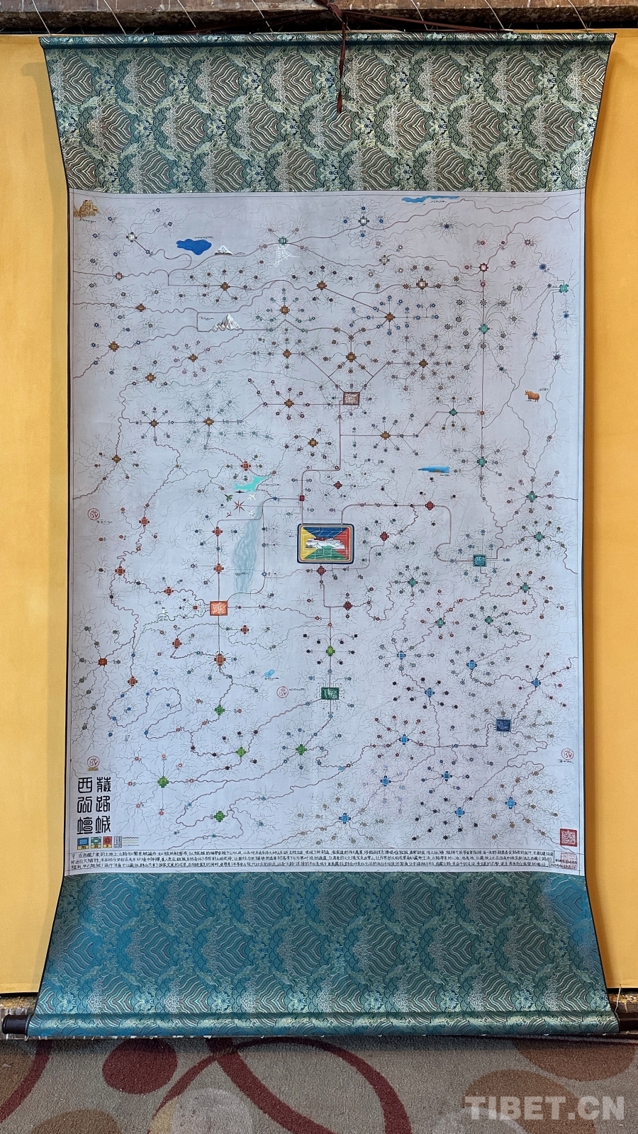 達(dá)布詳細(xì)解釋了這幅唐卡的圖像系統(tǒng):正方形代表市、區(qū),內(nèi)部畫有該市區(qū)主干道地圖;十字方形代表縣;圓形寶石形代表鄉(xiāng)鎮(zhèn);藏文“嗡”字代表名勝古跡;此唐卡以黑線為所有公路基礎(chǔ)線,黑線邊上的紅黃線代表國(guó)道和高速,綠線代表省道,黑細(xì)線代表縣鄉(xiāng)鎮(zhèn)及村級(jí)公路。沿途還繪制了珠峰、古格王國(guó)遺址、納木錯(cuò)等代表性景點(diǎn),并用藏文標(biāo)注名稱。