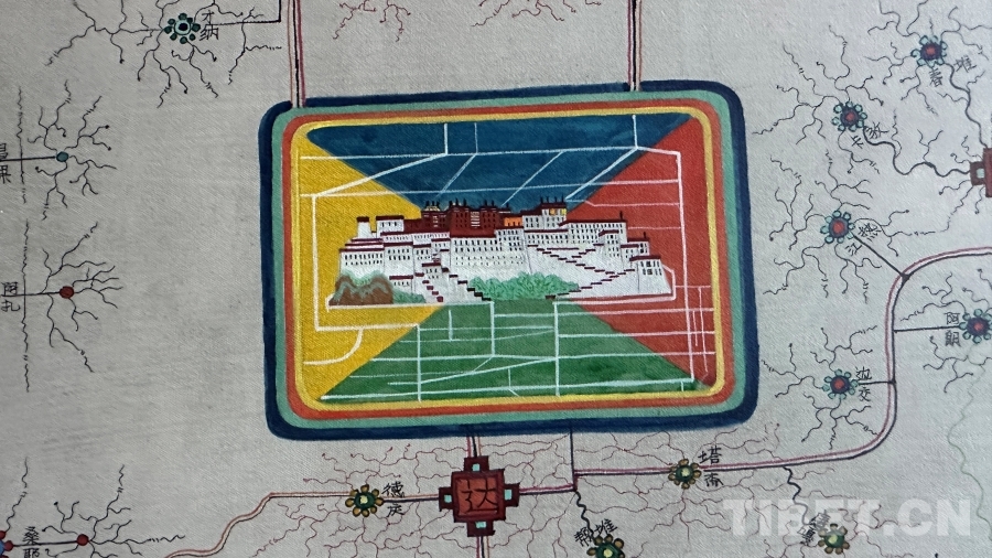 作為一件與地圖密切相關(guān)的作品,達(dá)布主要依據(jù)公路主線和國(guó)家公布的行政區(qū)域進(jìn)行描繪,對(duì)于一些在常用地圖上無(wú)法精確定位的地名,采取了審慎態(tài)度。達(dá)布還追溯了西藏的地圖繪制傳統(tǒng),認(rèn)為可以從著名的《西藏鎮(zhèn)魔圖》開(kāi)始算起。然而,創(chuàng)作中的挑戰(zhàn)并沒(méi)有阻礙他的創(chuàng)作熱情。“畫著這幅畫,我覺(jué)得這是一個(gè)普通唐卡畫師用畫筆感恩當(dāng)下,是對(duì)歷史的真實(shí)記錄,對(duì)偉大工程成果的贊揚(yáng),也是對(duì)傳統(tǒng)唐卡表現(xiàn)形式的突破和思考。”