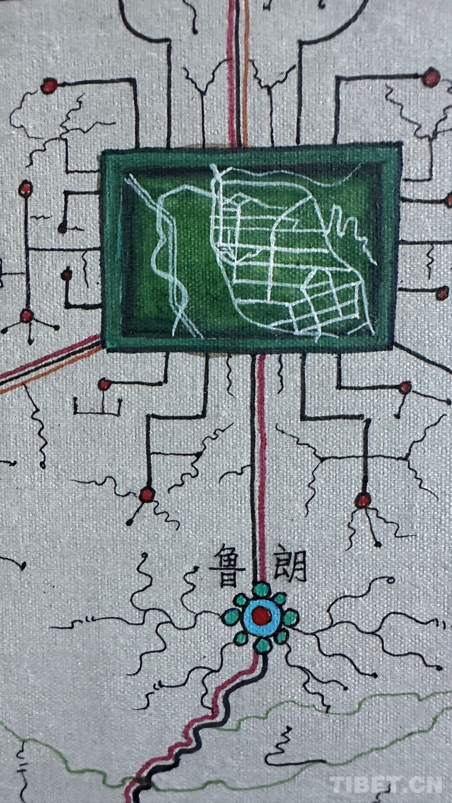 創(chuàng)作過(guò)程中最大的困難是如何藝術(shù)地表現(xiàn)公路網(wǎng)絡(luò)。“我通過(guò)分析現(xiàn)代地圖、衛(wèi)星導(dǎo)航、古代寶藏圖和手繪地圖,發(fā)現(xiàn)西藏公路是順應(yīng)地貌修建的?!边_(dá)布描述著他的發(fā)現(xiàn),“沿著河流,一條河有幾個(gè)分支就有幾條路;沿著山谷,一個(gè)大山谷有幾個(gè)小山溝就有幾條路。俯看就像一棵大樹(shù),又像是電腦芯片,一條主干道邊上分出無(wú)數(shù)支線?!?nbsp;