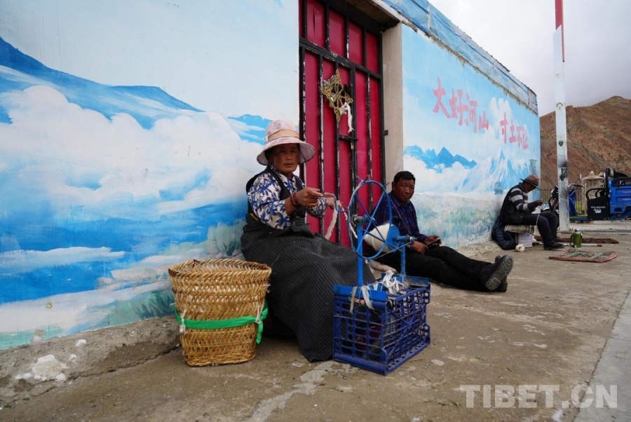 圖為崗巴縣吉汝村村民在街巷中紡織毛線