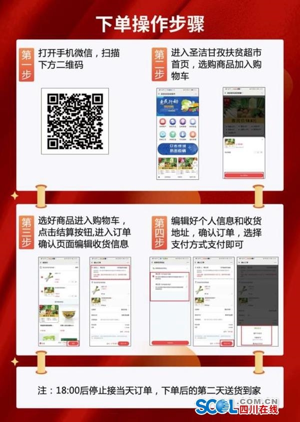 “防疫套餐”送貨上門惠民行動(dòng)從2月9日開始試運(yùn)行,2月10日第一批蔬菜貨物正式送到家。家住在康定市新老城區(qū)的市民,只需通過掃描電子宣傳單的二維碼,進(jìn)入圣潔甘孜扶貧超市首頁(yè),選購(gòu)商品加入購(gòu)物車,點(diǎn)擊結(jié)算,進(jìn)入訂單確認(rèn)頁(yè)面編輯收貨信息,之后確認(rèn)訂單選擇支付方式支付即可。當(dāng)天下單,最遲第二天就能在家免費(fèi)收貨。