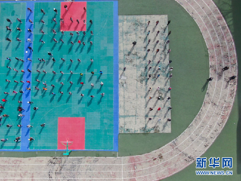 在青海省玉樹藏族自治州八一孤兒學(xué)校,學(xué)生們在進(jìn)行課間活動(dòng)(4月3日攝,無人機(jī)照片)。新華社記者 張龍 攝