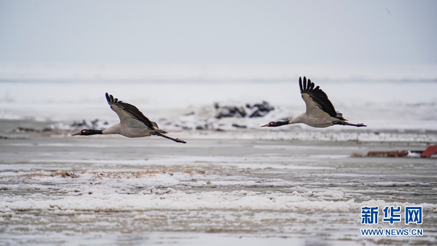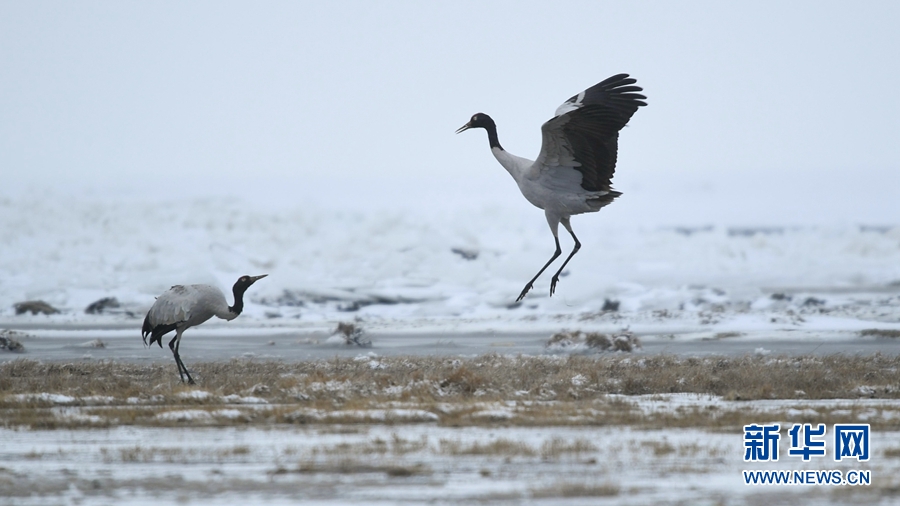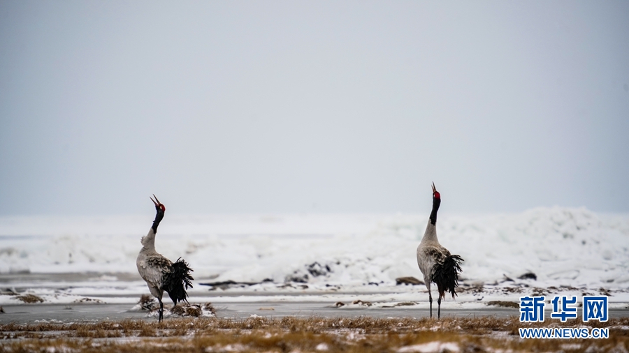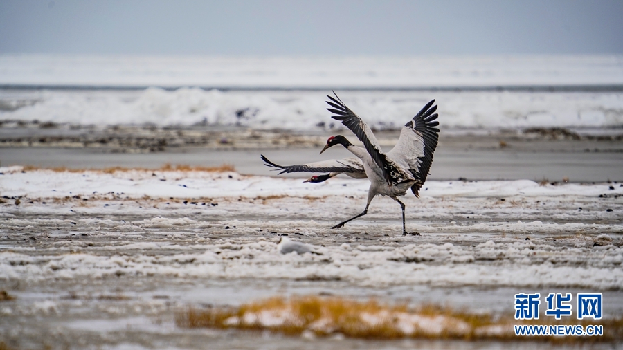 4月17日,受冷空氣影響,青海省海北藏族自治州剛察縣迎來一場(chǎng)春雪,兩只雪域“精靈”黑頸鶴在青海湖仙女灣景區(qū)“與雪共舞”,上演青海湖畔最美“雪中情”。