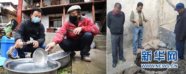 拼版照片:左圖為4月21日,勒阿村駐村第一書記張金利(左)在村民屠海榮家查看自來水管情況(新華社記者陳斌攝);右圖為2019年10月18日,張金利(中)指導村民挖自來水防凍井(新華社發(fā))。