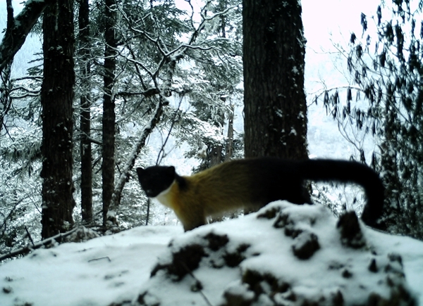 此次拍攝到的視頻資料顯示,在保護區(qū)多個點位都有大熊貓活動的身影,并且出現(xiàn)了多次,其中在同一區(qū)域,兩次拍到大熊貓嗅味樹標記行為;在同一點位同時拍攝到大熊貓、川金絲猴、金貓、黃喉貂、黑熊、毛冠鹿、野豬、豪豬等8種動物活動影像。此外,保護區(qū)還首次拍攝到金貓活動影像。