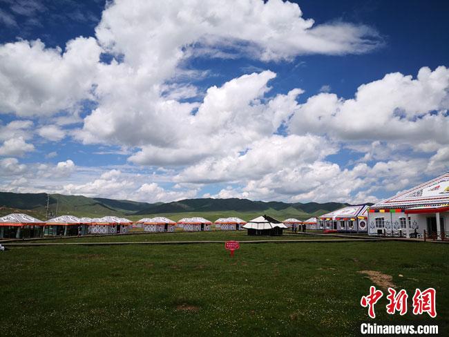 6月下旬,甘肅甘南藏族自治州碌曲縣尕海鎮(zhèn)境內(nèi)晴空萬里,湛藍(lán)的天空如同水洗過般通透明亮,輕薄如棉的云朵隨風(fēng)移動(dòng)。被一碧萬頃的草原簇?fù)碇逆匦愦?,滿目皆是古老藏飾風(fēng)格與現(xiàn)代時(shí)尚的交織融合,吸引絡(luò)繹不絕的游人前來體驗(yàn)“高原秘境”。