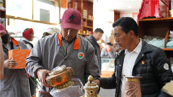 桑旦蘭周向記者介紹甘達(dá)村家庭小作坊生產(chǎn)的產(chǎn)品。陳安陽(yáng) 攝