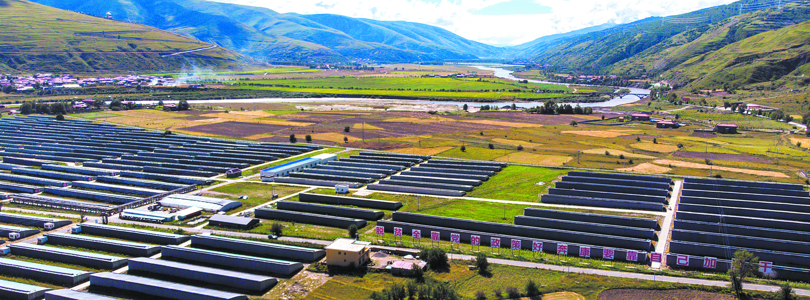 湛藍(lán)的天空中漂浮著片片白云,靜靜的鮮水河在一座座披著綠色盛裝的大山間流淌,河谷的開闊地帶,一座座蔬菜大棚整齊地排列著,遠(yuǎn)遠(yuǎn)望去,猶如披上綠裝的蒙古包,連綿不斷,與湛藍(lán)的天空交相輝映。