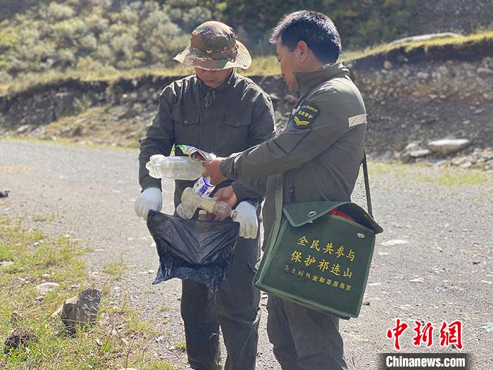 圖為9月9日,生態(tài)管護(hù)員王學(xué)清(右)在巡護(hù)過(guò)程中撿拾垃圾。 中新社記者 李江寧 攝