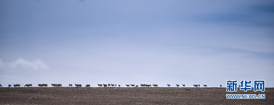青??煽晌骼锏貐^(qū),一群雌性待產(chǎn)藏羚羊通過青藏公路后向卓乃湖行進(2016年6月7日攝)。新華社記者 吳剛 攝
