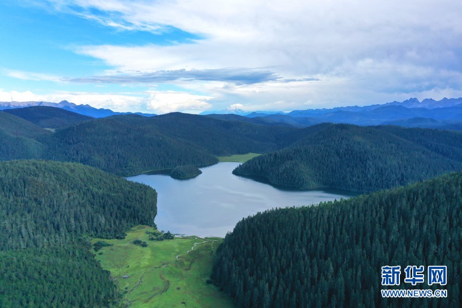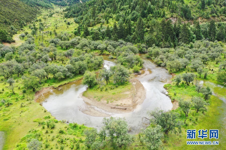 航拍視角下的普達措“幾”字形河道(攝于8月27日)。新華網(wǎng) 趙普凡 攝