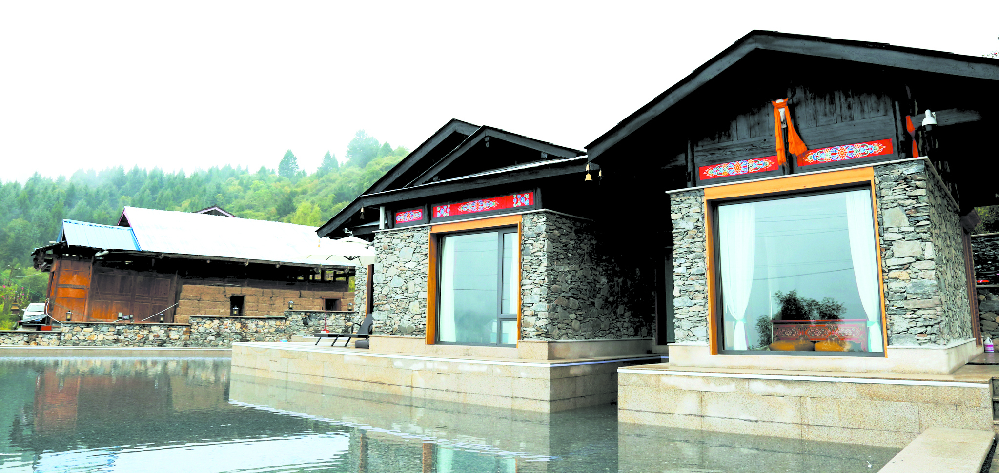 往前方望去,山勢(shì)起伏,云海翻卷,氣象萬千;往身后看,現(xiàn)代氣息的落地窗與石條砌墻灰瓦覆頂,結(jié)合藏式文化元素的新藏寨,在屋前環(huán)繞的水面倒映下,一個(gè)未來網(wǎng)紅打卡地呼之欲出。